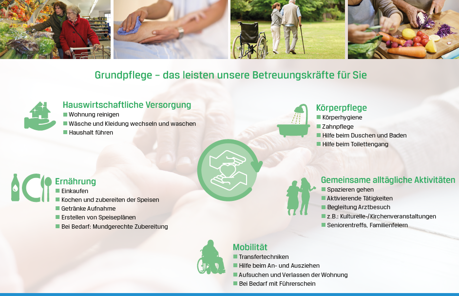 Grundversorgung und individuelle häuslichen Betreuung bedeutet eine individuelle Versorgung im eigenen Zuhause. Diese Grundpflege stellen wir durch eine Betreuungskraft sicher, die in Ihrem Haushalt lebt. Unser Konzept beinhaltet Lösungen für die Grundpflege, die Bereiche der Körperpflege, der Ernährung und der Mobilität, sowie andere nicht-medizinische Pflegetätigkeiten aus den Bereichen der Aktivitäten des täglichen Lebens. Die Durchführung ärztlich verordneter Behandlungen, wie die Verabreichung von Medikamenten, Injektionen, Verbandwechsel etc. sind aus dem Bereich der Behandlungspflege und werden durch ambulante Pflegedienste oder Ihren Arzt durchgeführt. Wir kooperieren sehr gerne mit den einzelnen Partnern vor Ort und bilden so ein optimales Netzwerk an kompetenten Ansprechpartnern aus Ihrer Region.