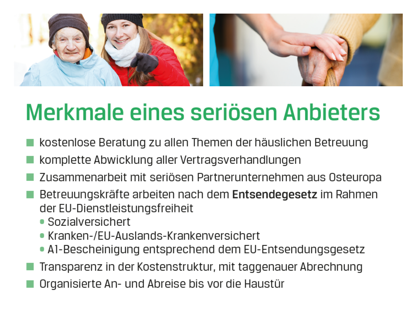 Ihre Betreuungskraft ist bei unserem ausländischen Dienstleistungsunternehmen legal und sozialversicherungspflichtig angestellt. Diese verfügen selbstverständlich über alle notwendigen Papiere, wie die A1-Bescheinigung und eine gültige EU- Krankenversicherung. Mit der A1-Bescheinigung weisen die Dienstleistungsunternehmen nach, dass die Betreuungskraft ordentlich und sozialversichert angestellt, und die Richtlinien der Entsendung gesetzeskonform einhält. Im Rahmen des Entsendegesetzes übernehmen die ausländischen Pflegekräfte zeitlich befristet die Betreuung und sind während dieser Zeit an Weisungen des ausländischen Arbeitgebers gebunden. Die Dienstleistungsunternehmen achten auf die gesetzlich erlaubte Betreuungsdauer und organisieren auf dieser Basis den Einsatz und die Aufenthaltsdauer der Pflegekraft. In der Regel ist die Pflegekraft zwei bis drei Monate im Wechsel mit einer zweiten Pflegekraft bei Ihnen vor Ort. Auf diese Weise haben Sie immer eine Pflegekraft im Haus die Ihre persönliche Situation kennt. Bei Ausfällen wie Krankheit oder Unfall können wir schnell agieren und eine Ersatzkraft für sie organisieren. Da wir auf das Wohl und Erholung der Pflegekraft sehr achten, sind die Wechselintervalle so gewählt. So hat Ihre Pflegekraft die Möglichkeit, sich im Rahmen der eigenen Familie zu erholen, um anschließend gestärkt und motiviert wieder anzureisen und die Betreuung weiter zu führen.